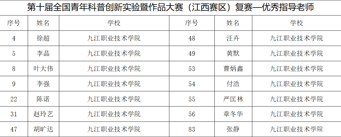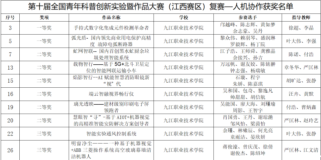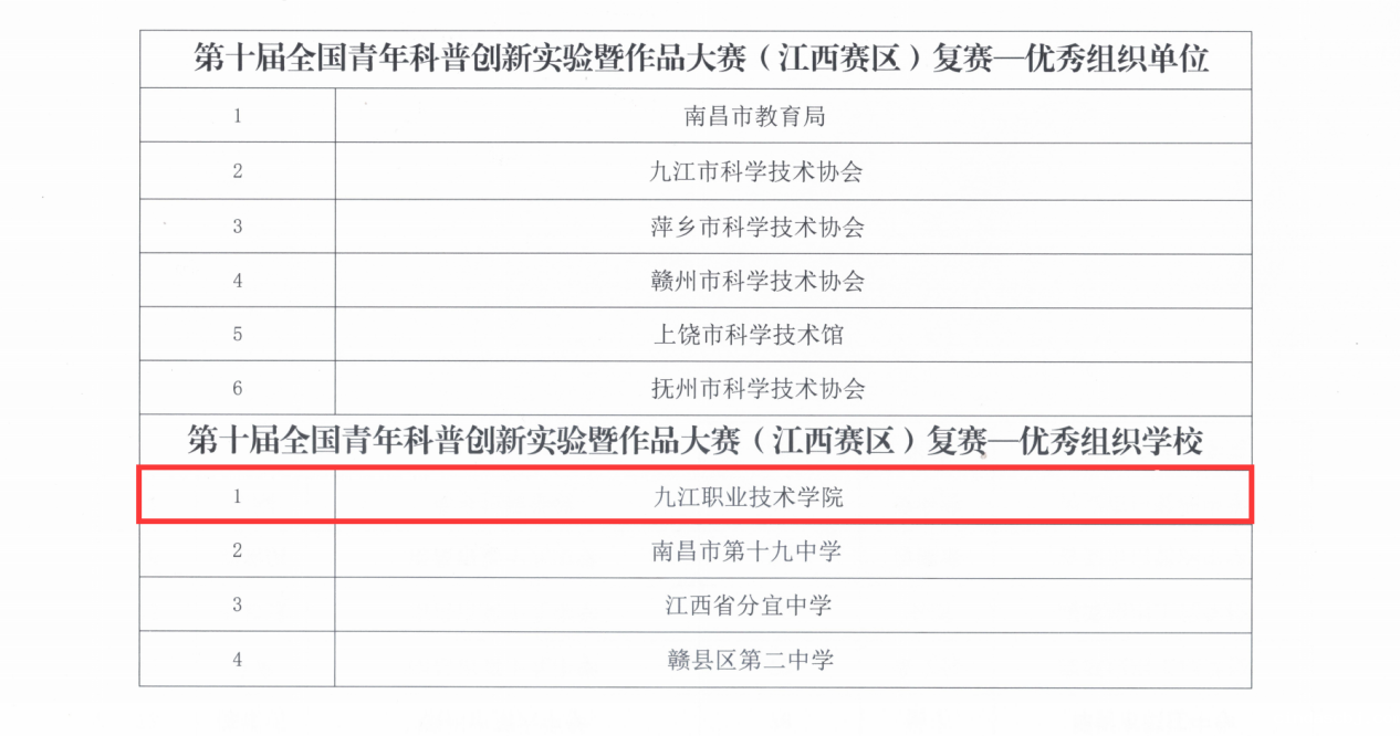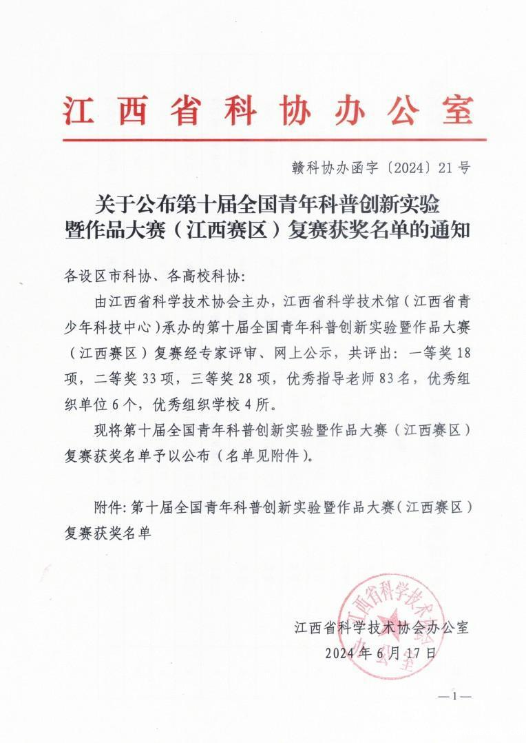 6月17日,由江西省科学技术协会主办,省科技馆承办的第十届全国青年科普创新实验暨作品大赛(江西赛区)复赛结果公布,我校凭借一等奖2项、二等奖6项、三等奖2项的优异成绩,成为唯一获评“优秀组织学校”的高等院校,14位指导老师被评为“优秀指导老师”。