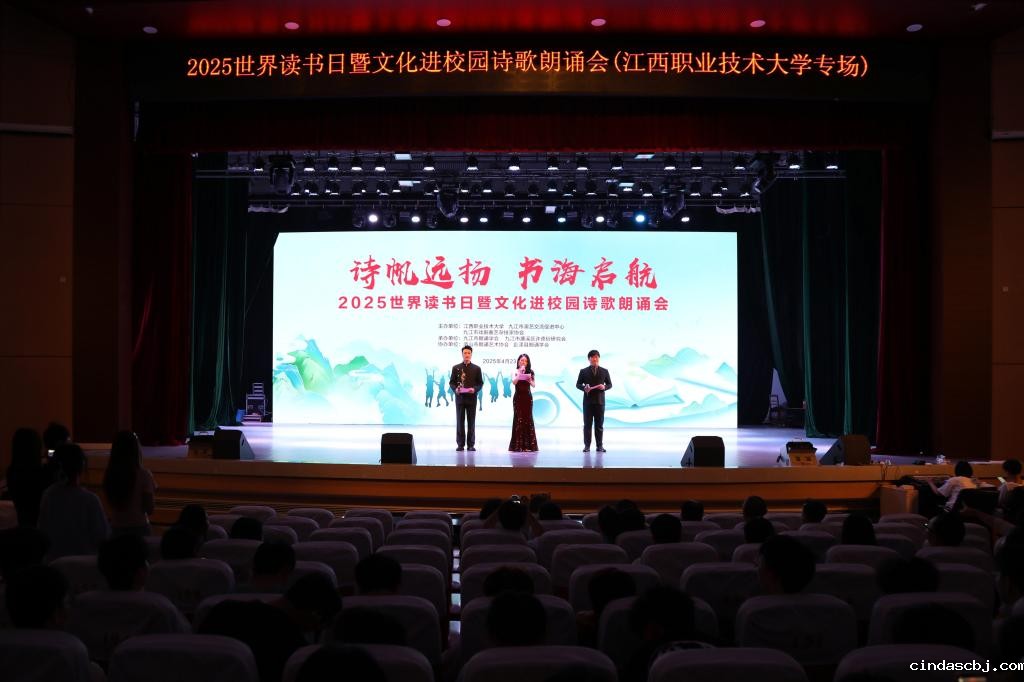 本网讯(校团委)为弘扬中华优秀传统文化,推进全民阅读,营造书香校园浓厚氛围。4月23日第30个世界读书日当晚,我校联合九江市朗诵学会等多家单位在十里校区大礼堂举办“诗帆远扬 书海启航”2025世界读书日文化进校园诗歌朗诵会,来自各二级学院、学生社团的700余名师生到场观看。